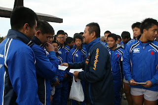 全国制覇を祈念して牧尾コーチからメンバー全員に勝ち守りを授与